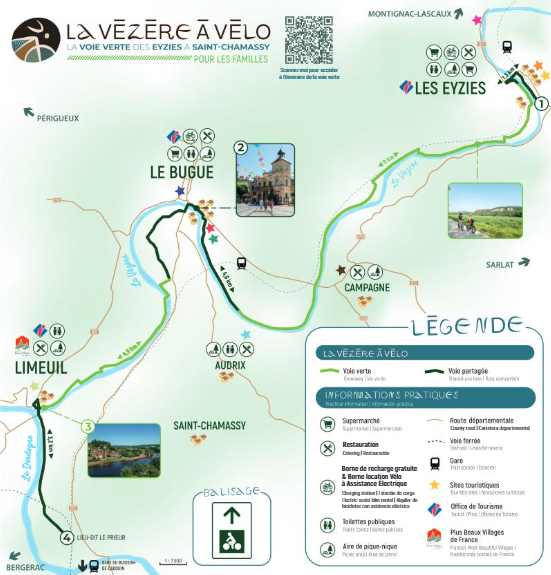 Une nouvelle voie verte appelée « la Vézère à Vélo », de 22km vous est proposée, qui relie 4 villages : les Eysies, le Bugue, Limeuil et Saint Chamassy.